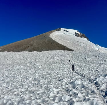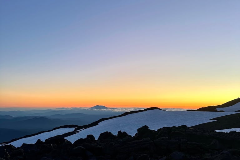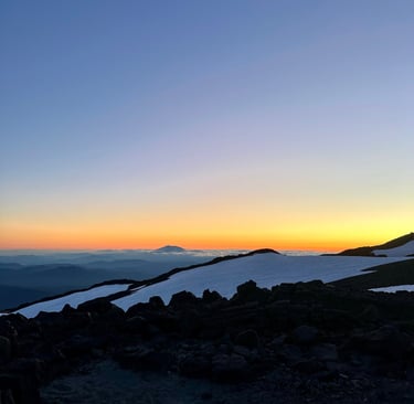 My mom, a couple of her friends, and one of mine started our adventure around 2pm July 10th with plans to summit the morning of the 11th. We hiked around 3 miles to lunch counter (9,300 ft elevation), which is base camp of Mt. Adams. We set up our tents, filtered our water, made dinner, and went to sleep. We had a 5am start the next day, headlamps on, cold air biting at our faces, boots crunching against snow that hadn’t yet softened under the sun. The sky was still dark, but the anticipation was loud. You don’t climb a mountain like Adams casually, you commit to it, mentally and physically, long before you ever take your first step and the altitude makes sure you earn every foot. As we hit the base of pikers peak, the group made a pitstop to put on our crampons. Here is where the adrenaline really began to set in.