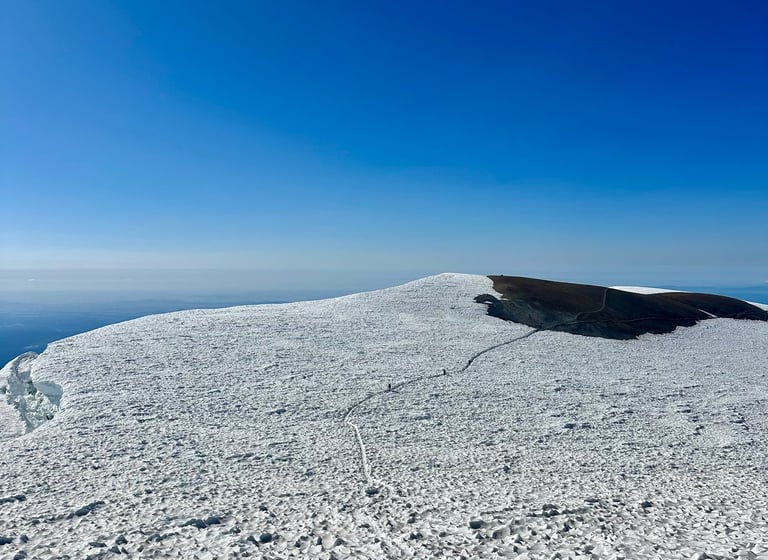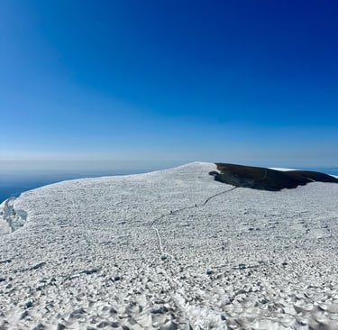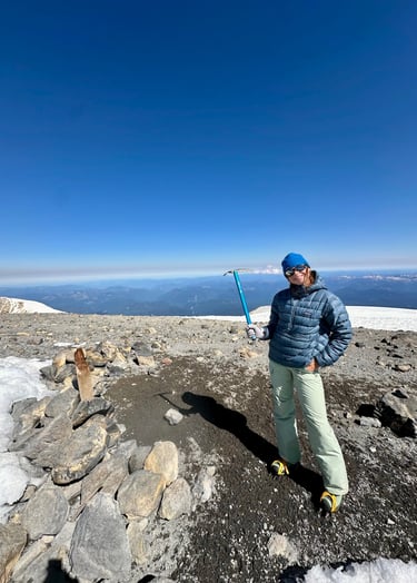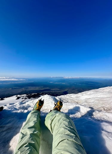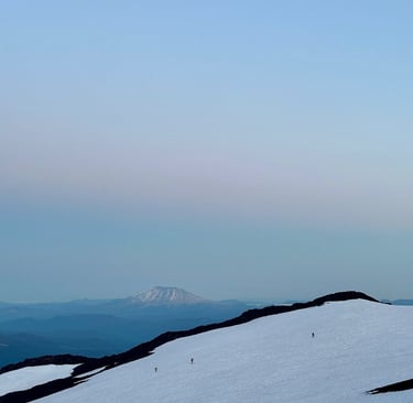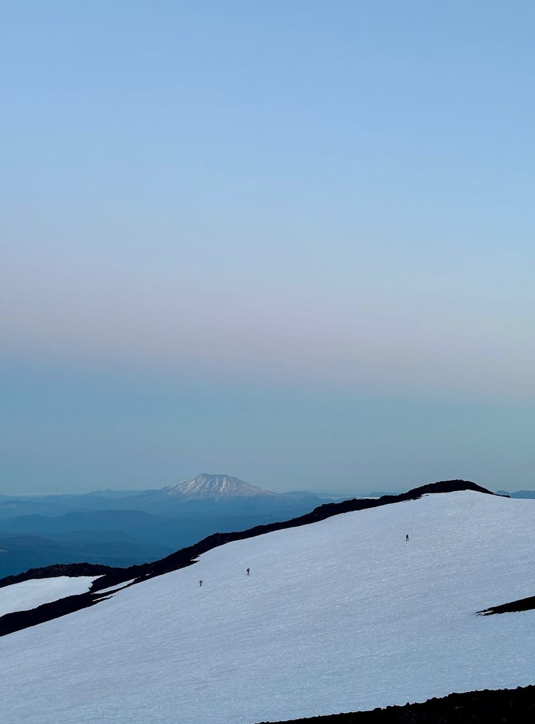 I reached the summit with one other at 10:30am, the rest of the group followed within the next half hour. We sat and ate, took too many pictures to count, and cried at the summit. We could see Mount Rainier in the distance, Mount Hood peeking through the horizon and a small Mt. Saint Helens sitting to our left. Being on the top of a mountain is surreal. I felt small, accomplished, and completely alive all at once. No notifications. No deadlines. Just wind, snow, and the quiet satisfaction of getting there under your own power.